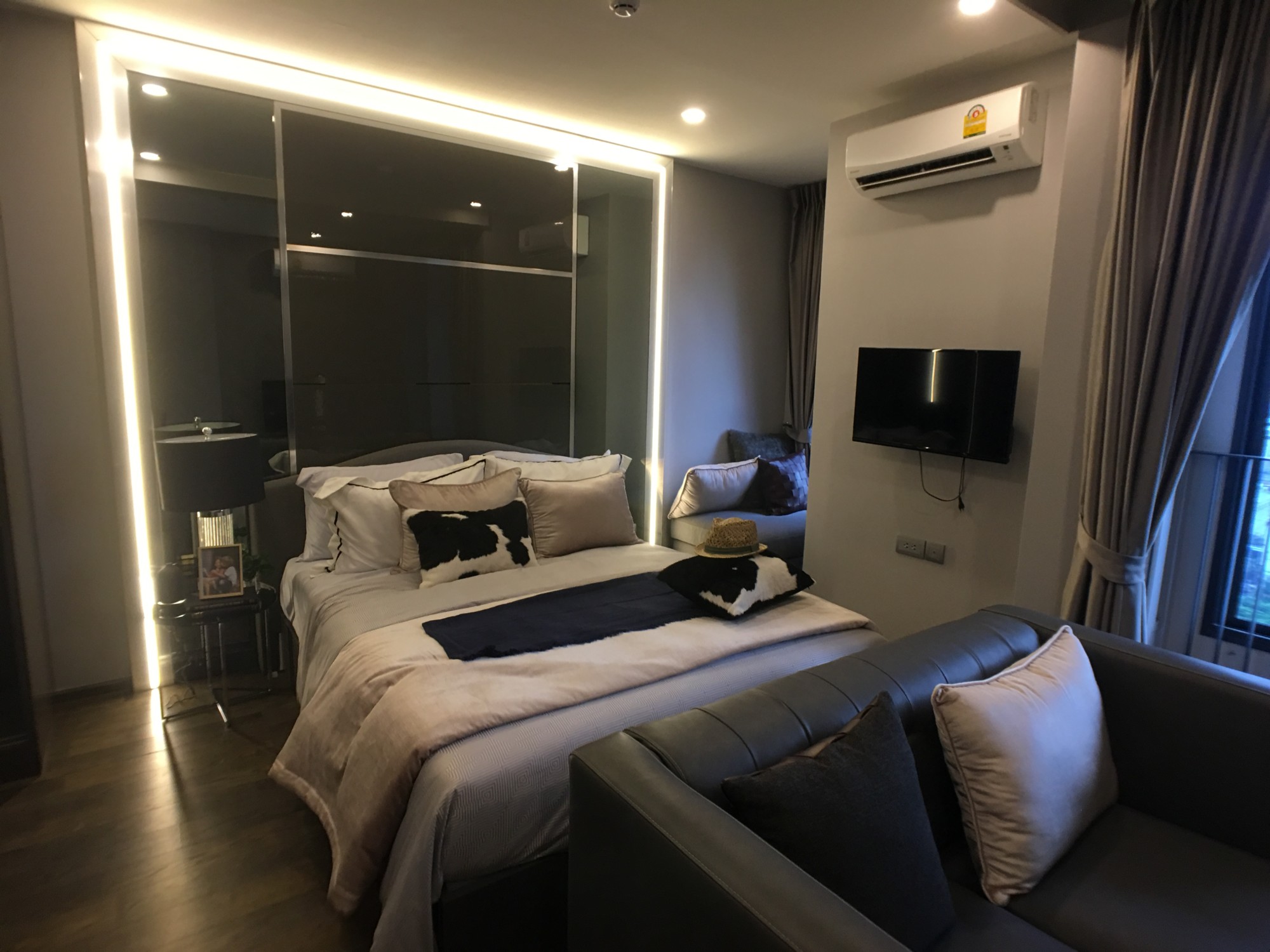 นอกนั้นผมว่าในห้อง spec มันเกือบจะใกล้เคียงกันเลย layout ในห้องก็เป็นแบบ โซฟาวางที่ปลายเตียง และมีประตูเลื่อนกั้นเตียง ออกจากโซฟาและ TV เป็น layout แบบเดียวกับ Ashton Asoke ด้วย (ผมไม่ค่อยจะชอบเลยอ่ะ มันก้ำกึ่งจะเป็น studio ยังไงก็ไม่รู้)